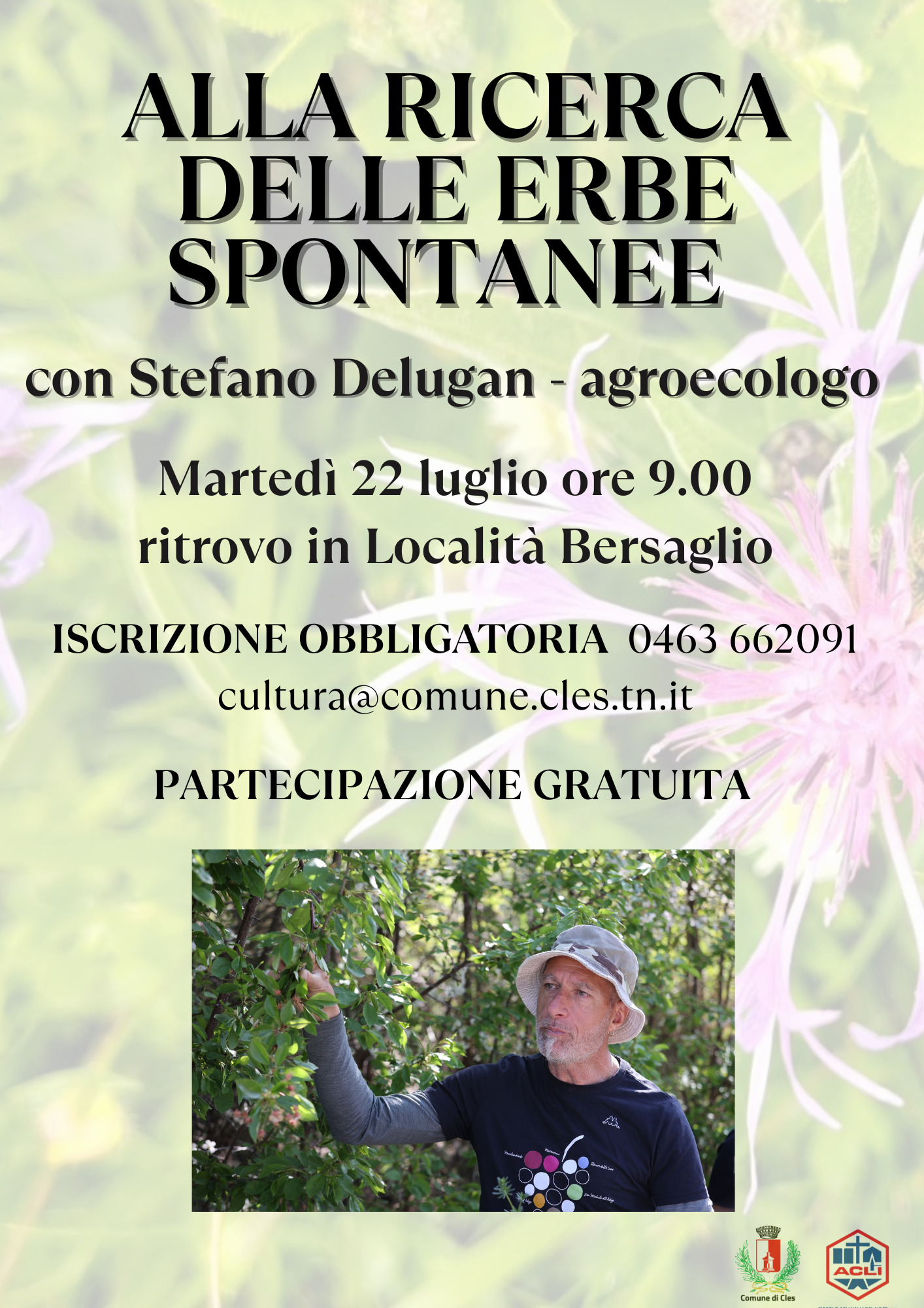 Alla ricerca delle erbe spontanee con Stefano Delugan agroecologo, una passeggiata alla scoperta delle erbe spontanee del nostro territorio, guidati da un esperto che ci accompagnerà nel riconoscimento e nell’utilizzo sostenibile di queste preziose risorse naturali - Martedì 22/07/2025 ore 9.00 – Ritrovo in Località Bersaglio (Cles) - Partecipazione gratuita
