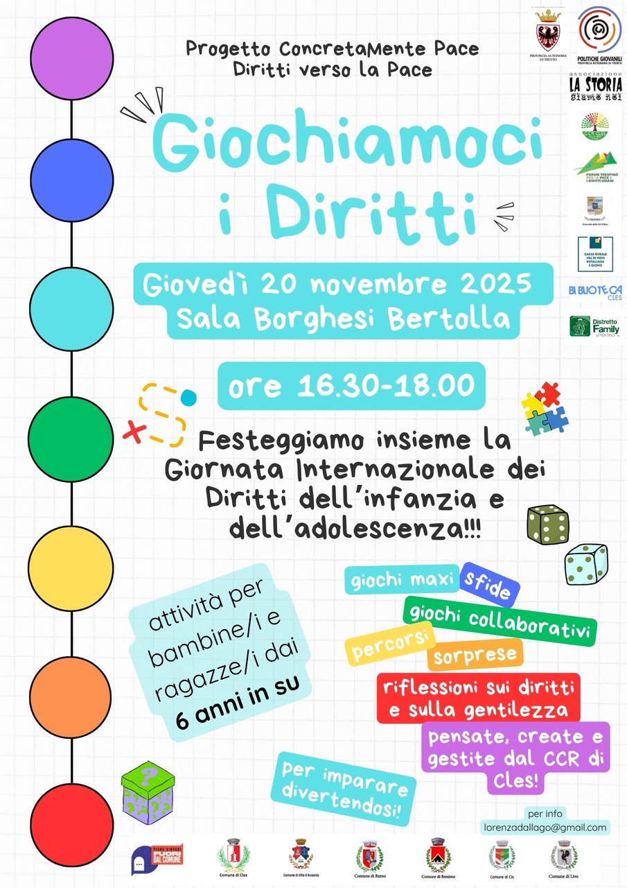 In occasione della Giornata internazionale dei diritti dei bambini e delle bambine e degli/lle adolescenti il consiglio comunale dei ragazzi di Cles propone delle attività sulle attività tematiche dedicate ai bambini e bambine sopra i 6 anni, presso la Biblioteca di Cles.