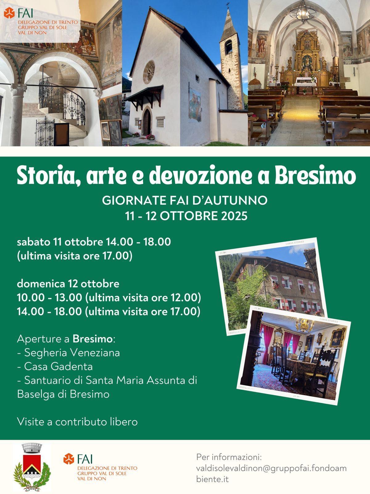 Due giorni per scoprire le bellezze di Bresimo, grazie alle Giornate del FAI (Fondo Ambiente Italiano) d'Autunno nelle giornate di sabato 11 e domenica 12 ottobre 2025.